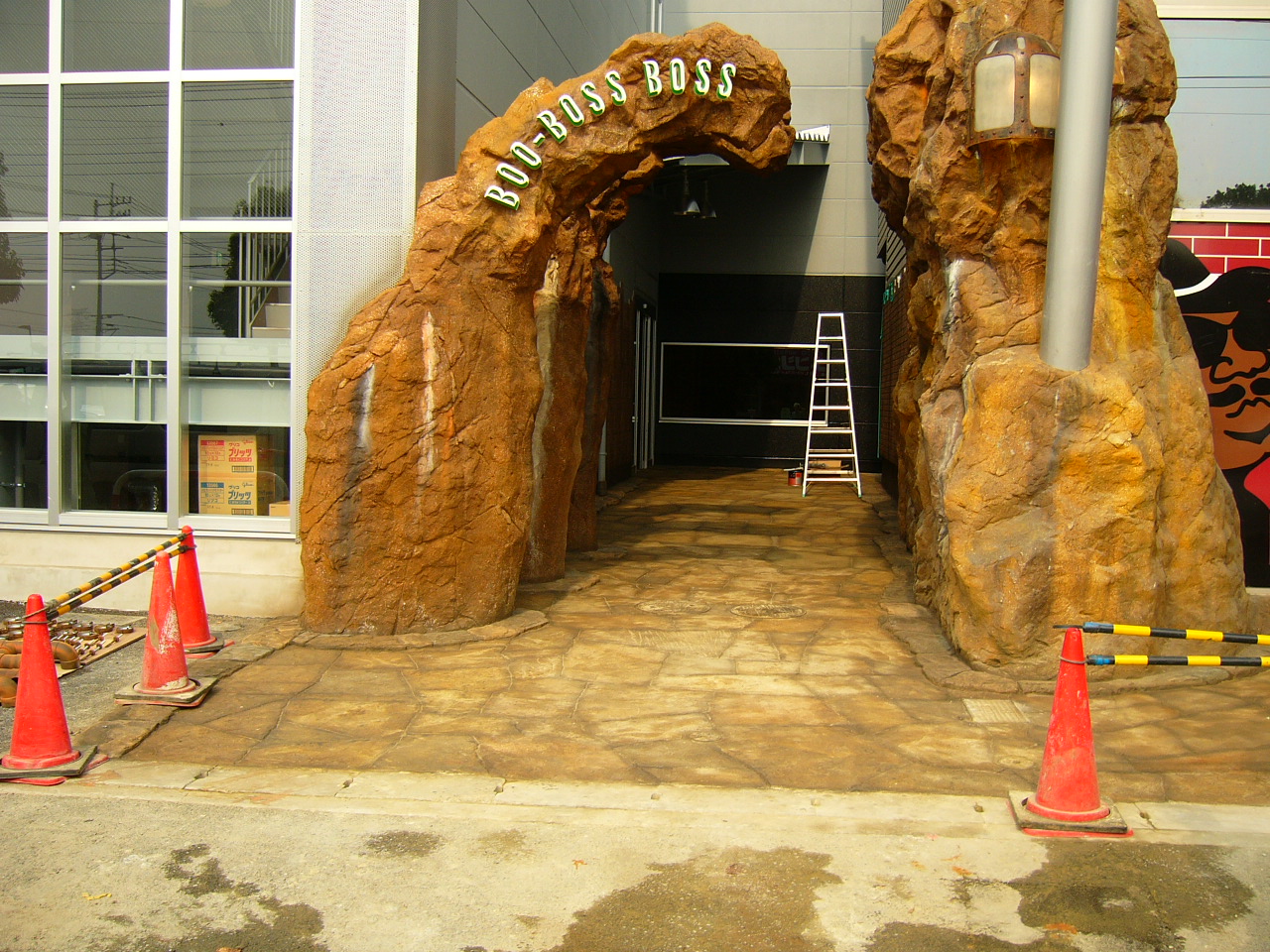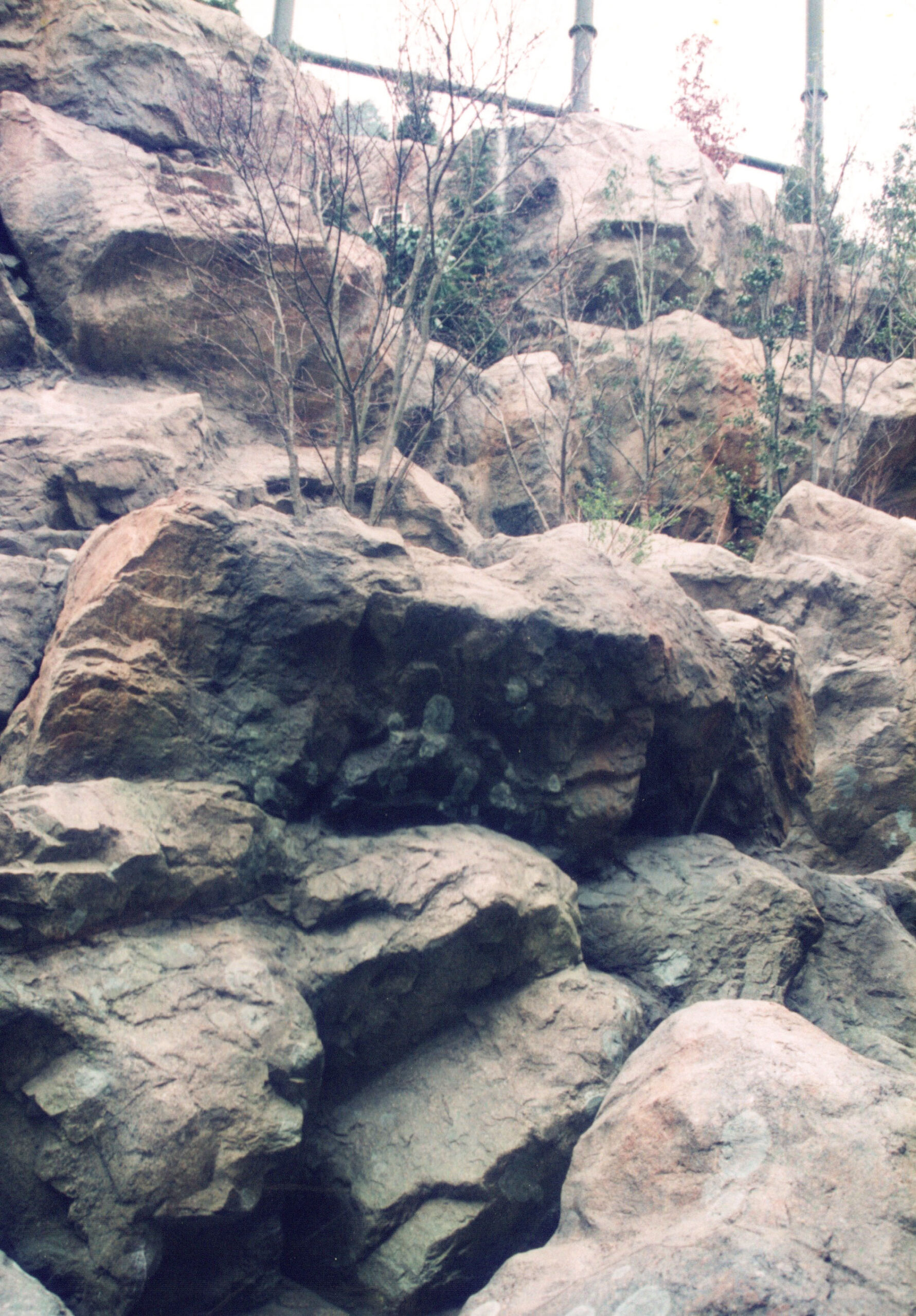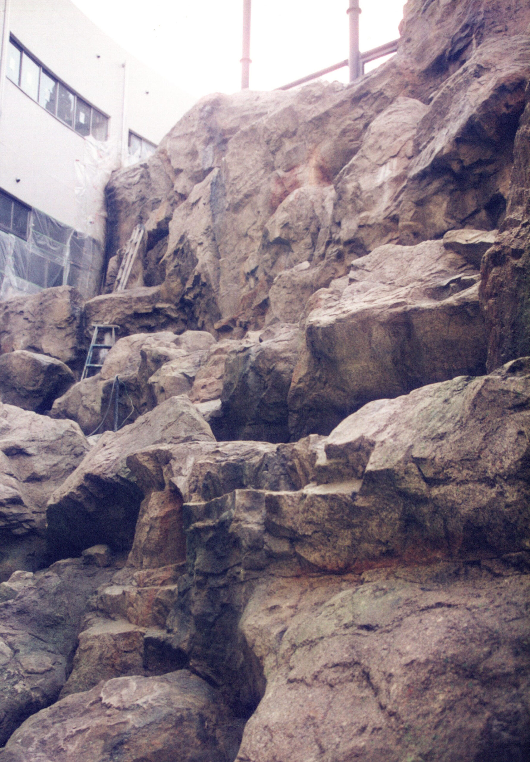 モルタル擬岩は材料にモルタルを使った擬岩でFRP擬岩とくらべ野外景観などに向いた工法です。制作は模型をもとに鉄筋や折り網(金網)で土台を制作し、その上にモルタルを塗布するもので、部分的にGFRCパネルをもちいて形を整えます。フィニッシュはカービングにより細かい岩のニュアンスを演出します。内部は空洞のため無駄な重量をかけずリアルな岩の表現が可能です。資料館、博物館のジオラマ、植物園や動物園、水族館、テーマパーク、また温泉やプールの屋内・野外の景観をリアルに演出します。
