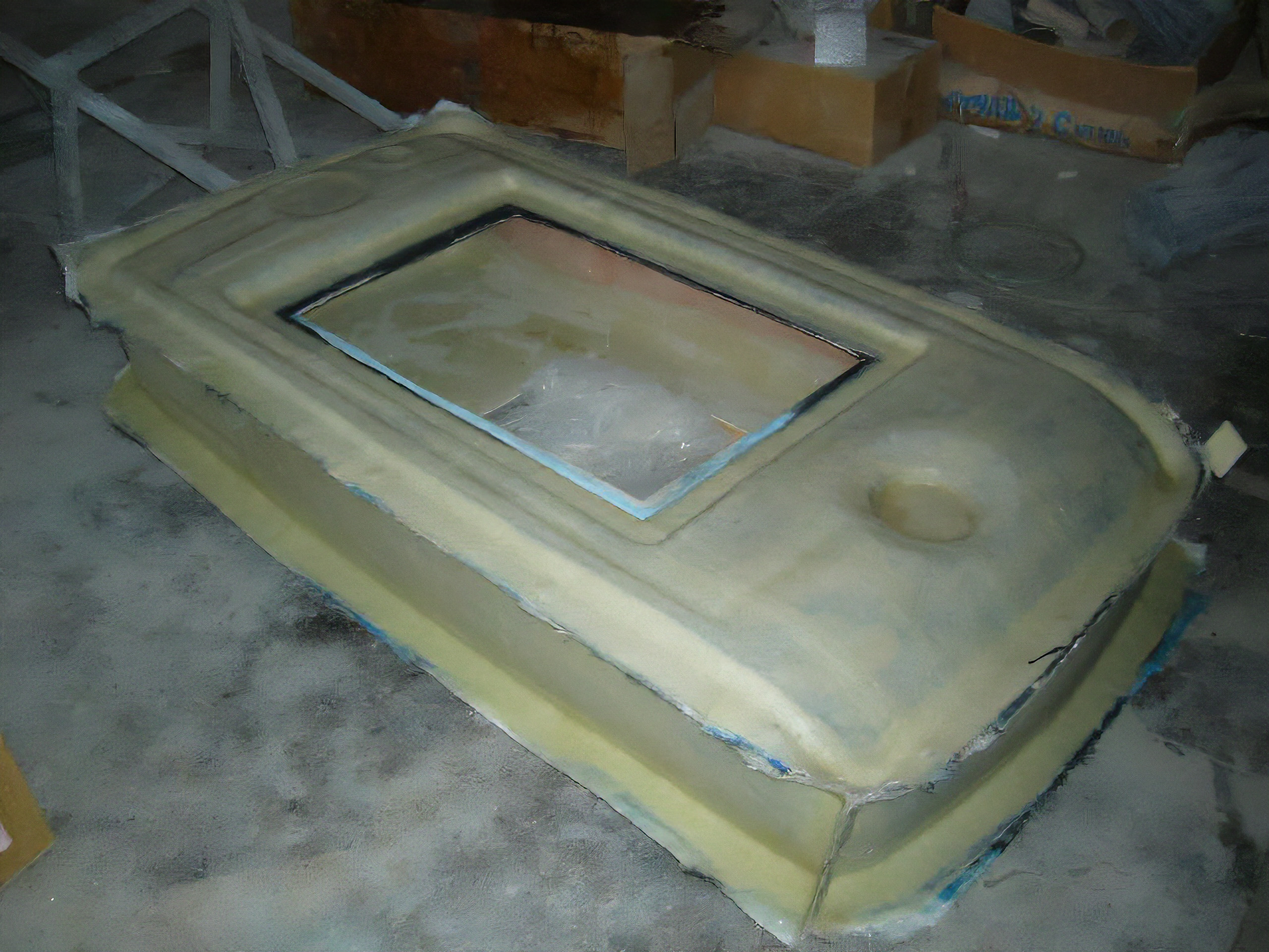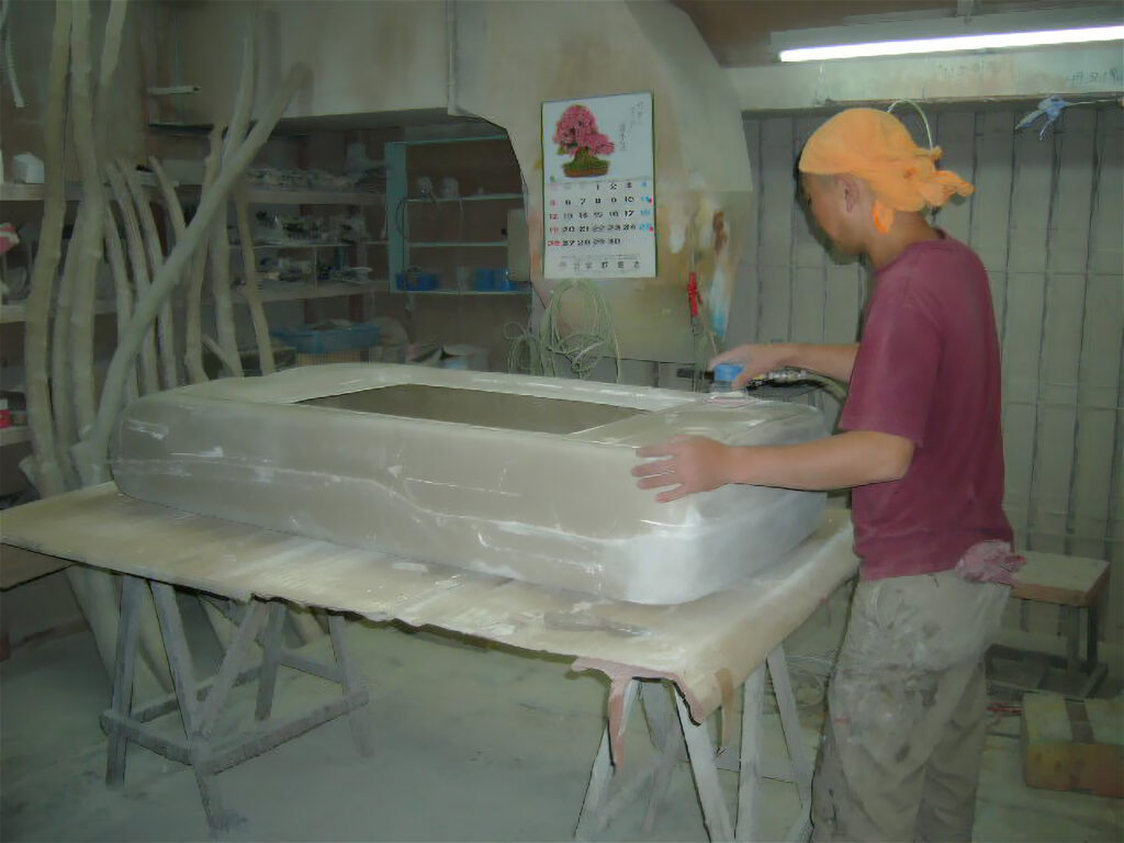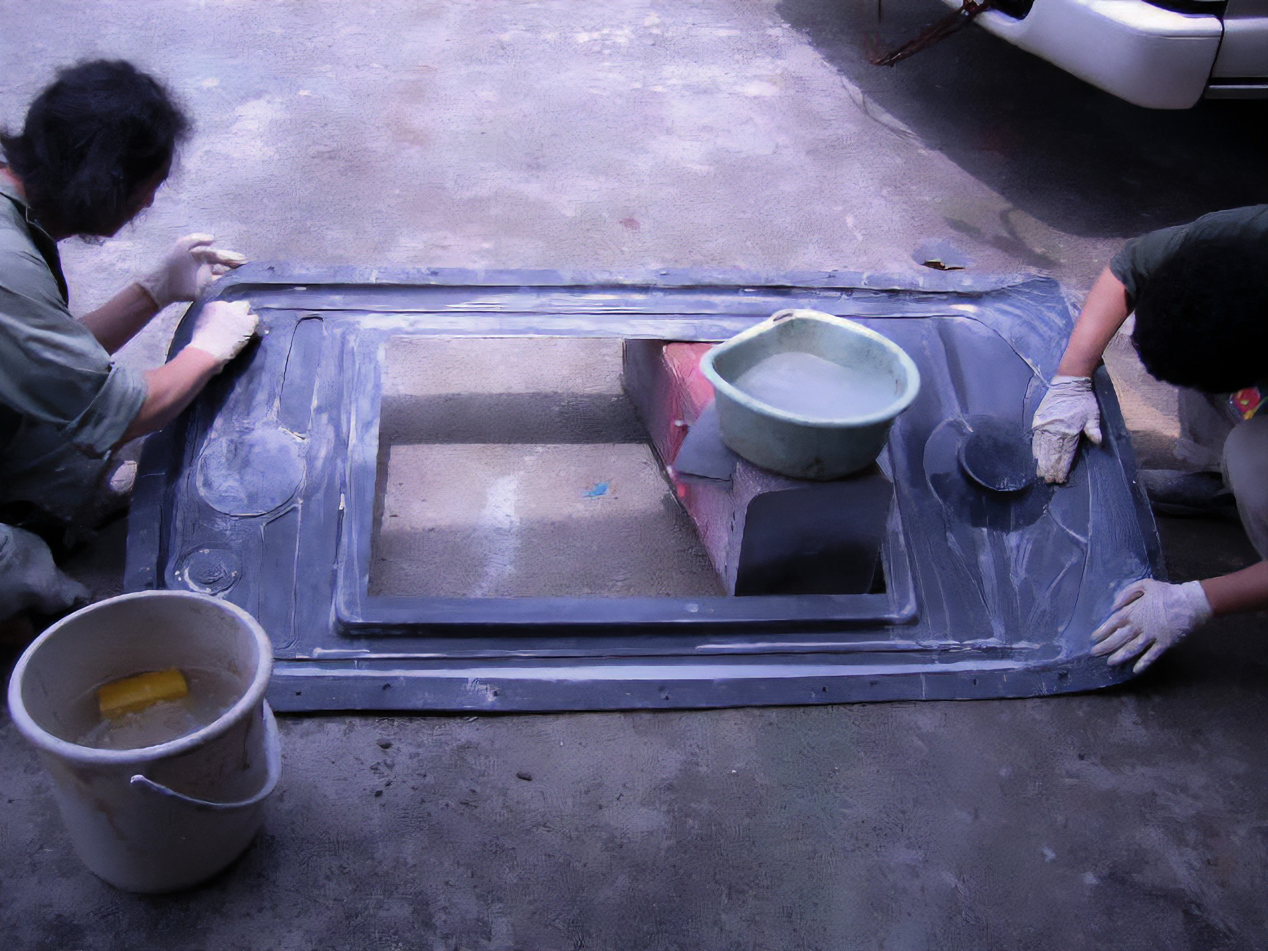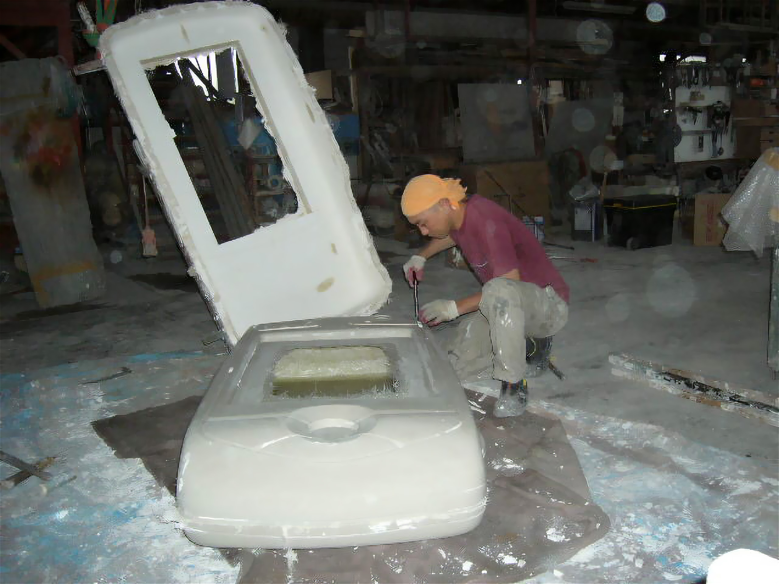 マスター型(FRP雄型)よりFRP雌型を作り、これから複数の製品を型抜きします。雌型にはシリコンゴムを使う場合もあります。
